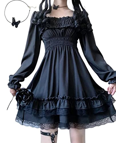 SUNNYSTEP Gothic Cosplay Lolita Kleid, Größen S-6XL, Schwarz, Langarm, Lolita, mit Schmetterlingschoker, Rüschen, Spitze, Schlicht, Übergröße, Knielang