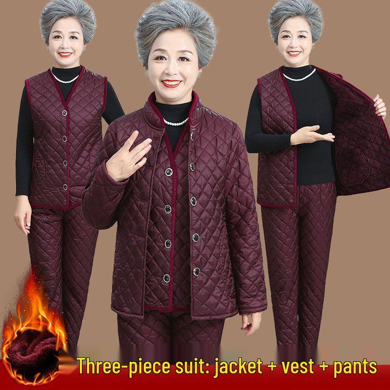 Warm Velvet Cotton Suit for Mom and Grandma: Autumn/Winter Three-Piece Set for Mature Women