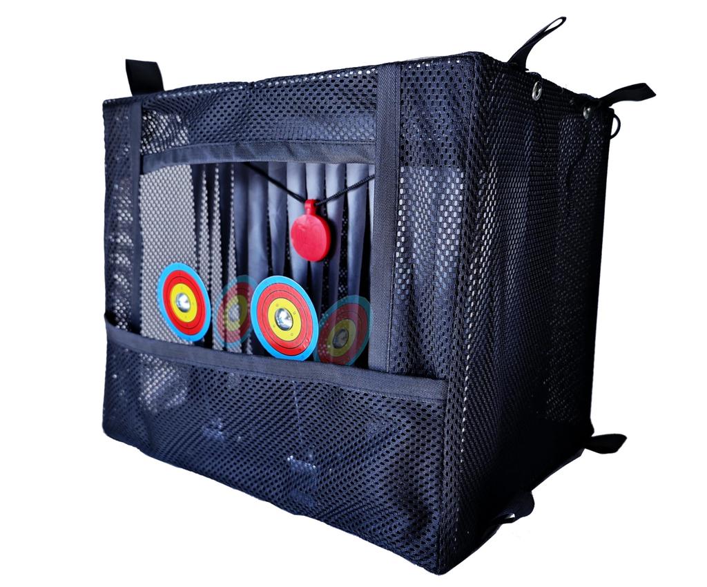 Paket beinhaltet: 1 Zielkasten, 2 selbstrückstellende Metall-Schießziele, 1 Gummi-Schießziel, 1 abnehmbarer doppelter schallschluckender Vorhang und Ersatzteile.