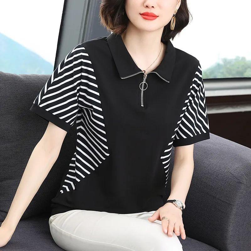 Baumwoll-Kurzarm-T-Shirt für Damen Sommer Neu Halbarm Große Größe Locker und Vielseitig T-Shirt Mama Gestreiftes Oberteil