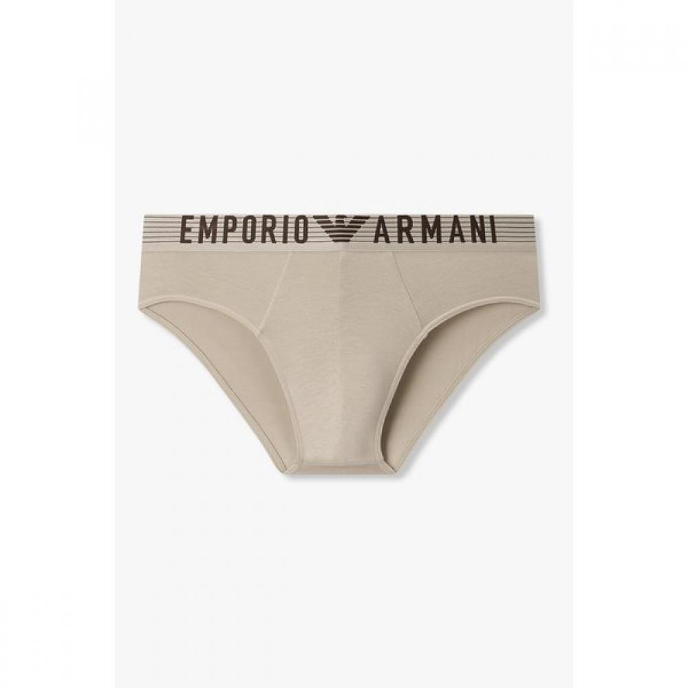 The Men's Stripe Banding Brief (Model No: 0816111038) is made from rayon blended material, providing a comfortable fit. It features a striped banding design and bold logo jacquard details, emphasizing style.