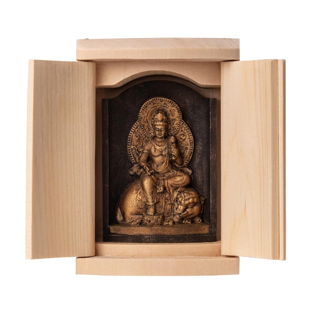 ■Fugen Bodhisattva (Fugen Bosatsu) - Amulett-Gottheit für diejenigen, die in den Jahren des Drachen und der Schlange geboren sind. Fugen Bodhisattva ist ein Bodhisattva, der in allen zehn Richtungen der Welt erscheint und Menschen mit geschickten Mitteln rettet.. Als Buddha, der die mitfühlenden Handlungen des Shakyamuni Buddha symbolisiert, ist er einer der Begleit-Bodhisattvas Shakyamunis, neben dem Bodhisattva Manjusri, der ihm Weisheit verleiht, und sitzt auf beiden Seiten des Shakyamuni Buddha.. Während Manjushri Weisheit repräsentiert, repräsentiert Fugen Mitgefühl, wobei Fugen bedeutet „derjenige, der in jeder Hinsicht weise ist.“ Dieser Bodhisattva ist sehr energiegeladen, erscheint überall und setzt die Lehren Buddhas mit Vernunft, Intelligenz und Mitgefühl in die Praxis um, um Menschen zu retten.. Es wird gesagt, dass sie zusammen mit dem Bodhisattva Manjushri ein Team bilden und sich zu den Seiten des Buddha Shakyamuni aufstellen, um die Menschen zu retten.. Sein Fahrzeug ist ein seltener, reinweißer Elefant mit sechs Stoßzähnen.. Nach dem Tod des Buddha erschien er auf diesem Elefanten in einem einsamen Gebiet und rettete die Menschen.. Wenn der weiße Elefant vorwärts geht, kann ihn nichts aufhalten.