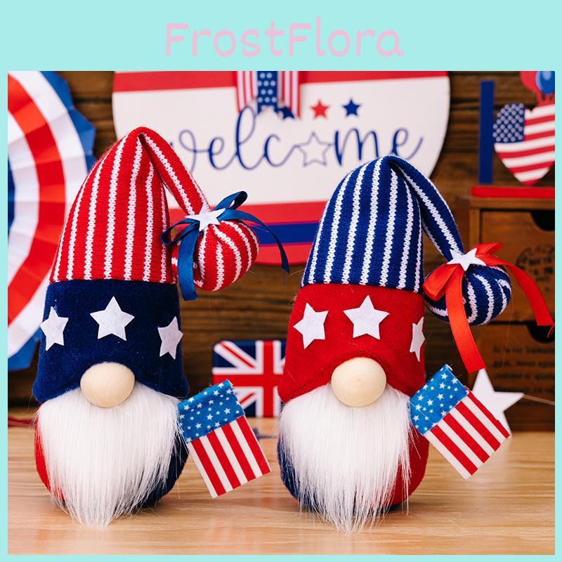 Festliches Design: Feiern Sie den Unabhängigkeitstag stilvoll mit unserer farbenfrohen Zwergpuppe mit einer lebhaften Strickmütze, die mit patriotischen Flaggenmotiven verziert ist.