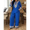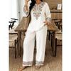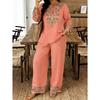 Damen Frühling Sommer Neues 2-teiliges Outfit, V-Ausschnitt 3/4-Ärmel Knopfleiste Hemd & Bedruckte Elastische Taille Lange Hose Set, Digitaldruck Maschine Lässiger Anzug
