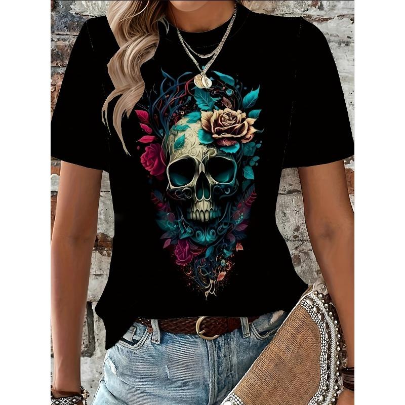 Europäische Größe Damen Lässiges Rundhals-T-Shirt Blumenschädel-Print Polyester-Spandex-Mischung Strickstoff Normale Länge Ganzjahres-Oberteil