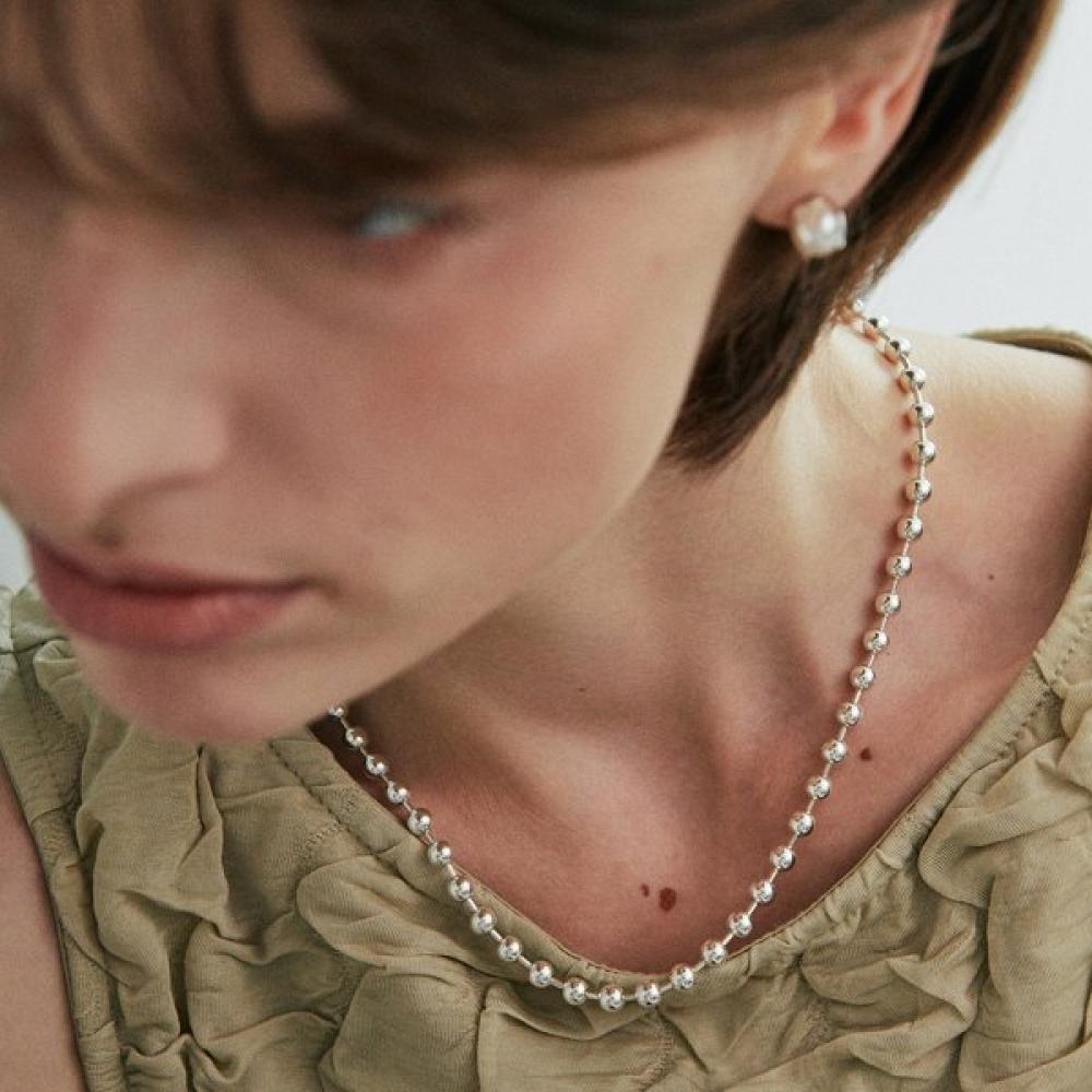 The [925 silver] Un.silver.209 / grand corde necklace features a simple circular shape with a 5mm ball necklace. With its modest size, it naturally blends in, providing a calm point within a clean silhouette. The smooth surface that seems to absorb light highlights the sparkling appearance, characterizing this grand cord style necklace.