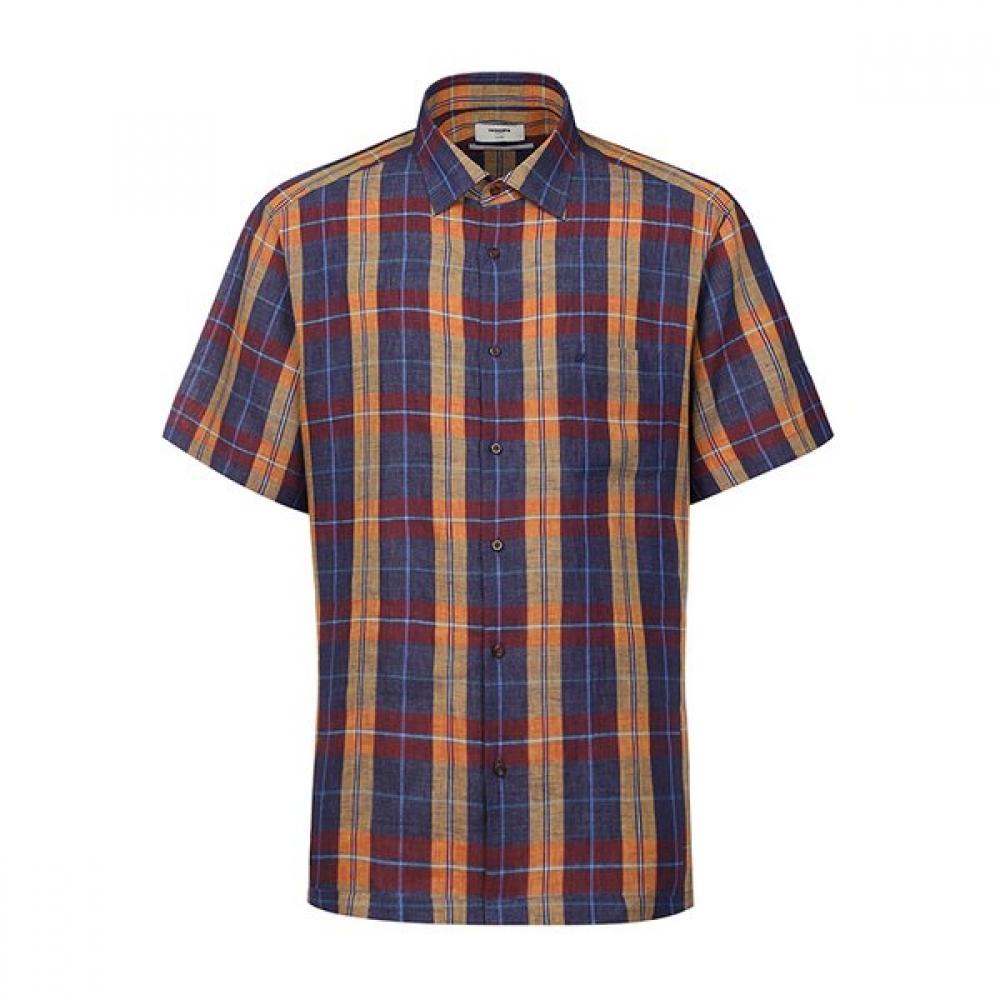 The Kkangkkolini Linen Check Short Sleeve Classic Shirt (Model: ROUSG1230-YE) is made from 100% natural linen, providing a luxurious and cool summer wear option. The straight hem design allows for a stylish look when worn untucked.