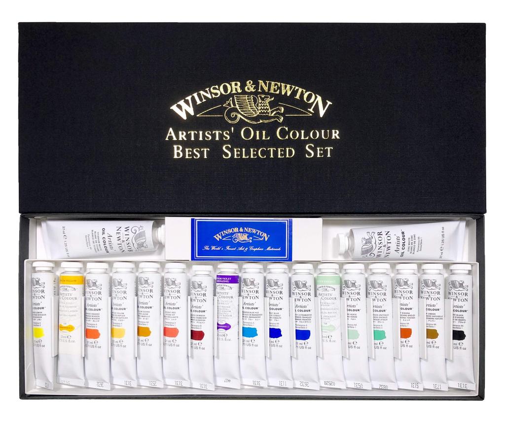 Set Contents: 644 Titanium White / 748 Zinc White (37ml each) / 722 Windsor Lemon / 108 Cadmium Yellow/724, Windsor Orange/422, Naples Yellow/744, Yellow Ochre/042, Bright Red/004, Alizarin Crimson/733, Windsor Violet Dioxazine/379, Manganese Blue Hue/178, Cobalt Blue/263, French Ultramarine/708, Windsor Emerald/637, Terre Verte/720, Windsor Green/074, Burnt Sienna/554, Raw Umber/331, Ivory Black (21ml each)