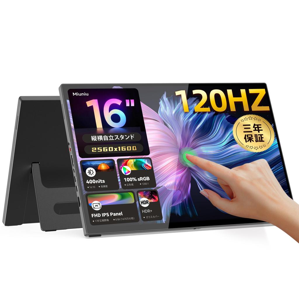 Miuniu M16QT Portable Monitor, 16-inch, 2560x1600 Resolution, 10-Point Touch Response, 120Hz Gaming Monitor, 16:10 Ratio, Freestanding Stand, sRGB 100% 400 Nits Glossy IPS LCD Panel, Compatible with PCs, USB Type-C and Standard HDMI, Metal Construction, VESA Compatible, 3-Year Warranty