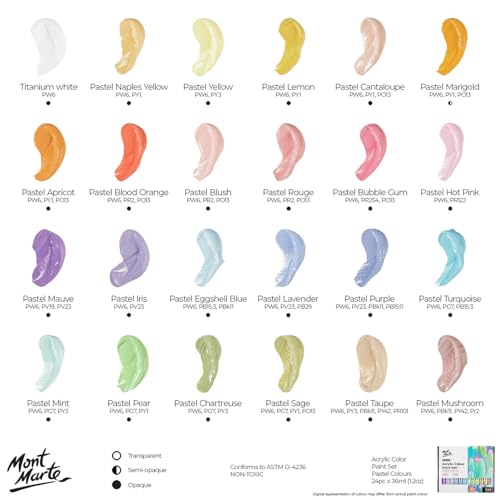 "24 Colors 36ml" This set contains 24 convenient and vibrant pastel colors, perfect for modern design, decorative items, and more. Set includes: 24 colors including Titanium White, Pastel Naples Yellow, Pastel Yellow, Pastel Lemon, Pastel Cantaloupe, Pastel Marigold, Pastel Apricot, Pastel Pumpkin, Pastel Blush, Pastel Rouge, Pastel Bubble Gum, Pastel Hot Pink, Pastel Mauve, Pastel Iris, Pastel Egg Shell Blue, Pastel Lavender, Pastel Purple, Pastel Turquoise, Pastel Mint, Pastel Pear, Pastel Chartreuse, Pastel Sage, Pastel Taupe, Pastel Mushroom