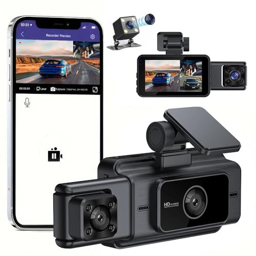 【3-Channel Dashcam】This dashcam has three displays: a front camera (records the area in front), a rear camera (records the area behind the vehicle), and an interior camera (records the driver and interior). All three cameras record simultaneously and can be displayed on the screen. The wide-angle front camera (140°) and rear camera (120°) reduce blind spots, and the reverse guidelines support parking.