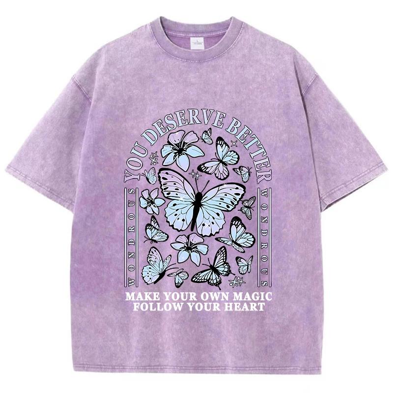 Modische gewaschene T-Shirts für Damen Sie verdienen Besseres Schöne Schmetterlings-Print-Tops Baumwolle Oversize Rundhals-T-Shirts Kleidung