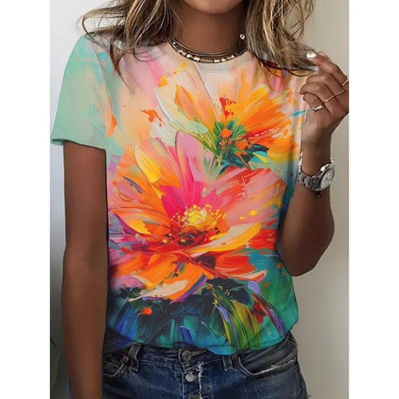 Damen 3D-bedrucktes Farb-T-Shirt - Schlank geschnittenes Rundhals-Oberteil mit kurzen Ärmeln für Frühling und Sommer, Freizeitkleidung, maschinenwaschbar