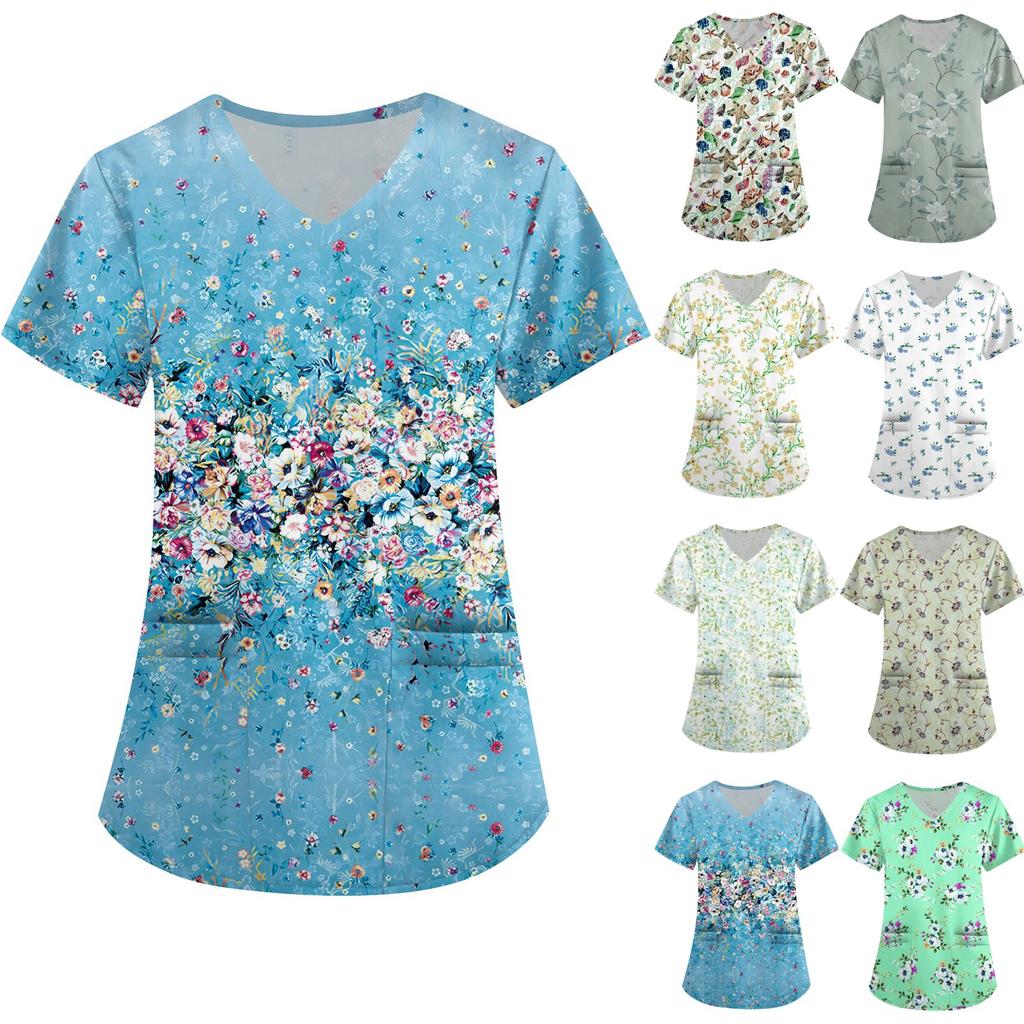 Süße bedruckte Arbeitskleidung für Damen, V-Ausschnitt, doppellagige Taschen, Basic, kurzärmeliges Oberteil, Pullover, Valentinstag