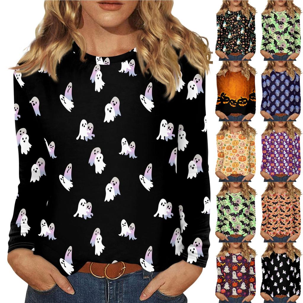 Langarmshirts Für Damen Niedliche Halloween-Print Grafik-T-Shirts Blusen Lässig Große Größen Basis-Oberteile Pullover