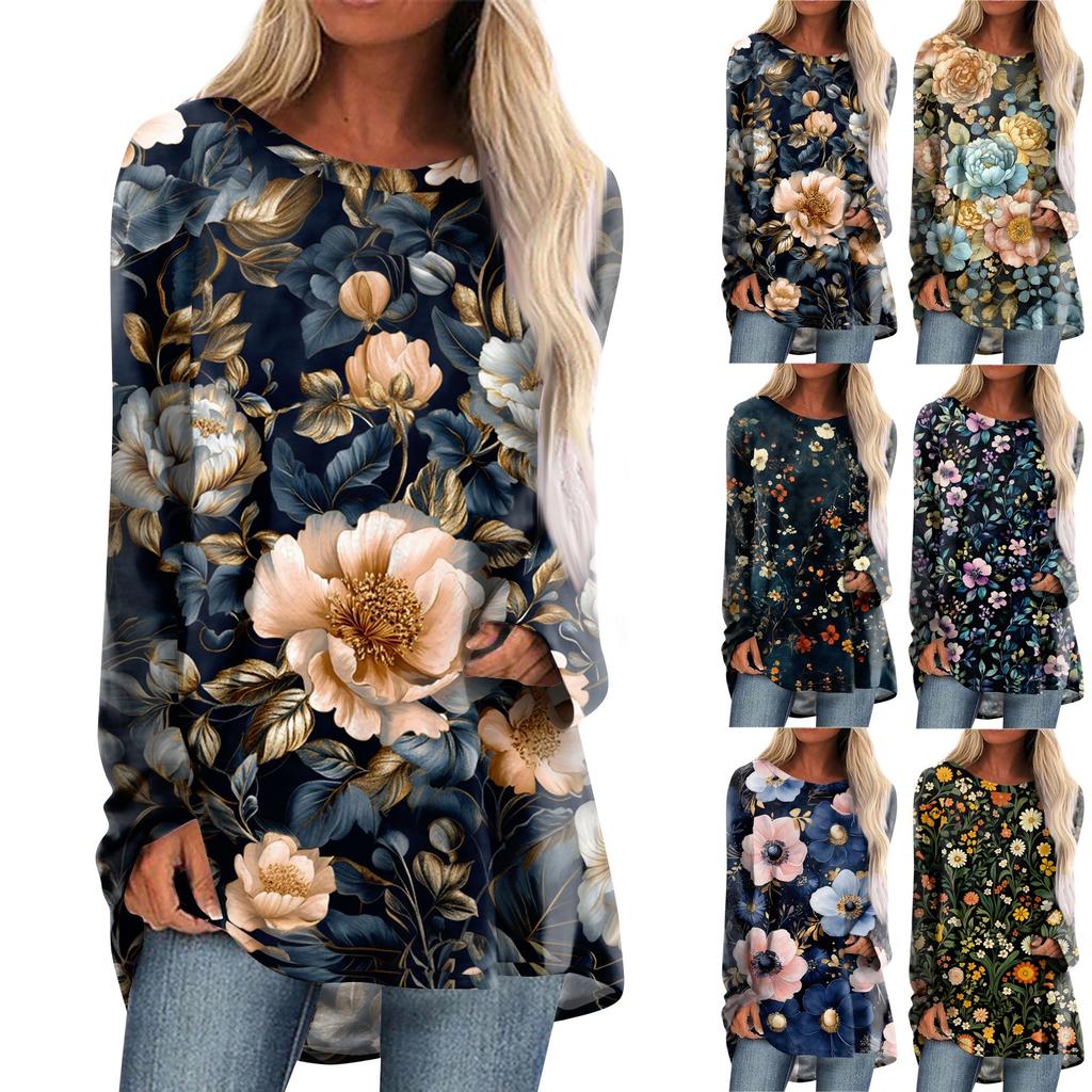 Damenmode Lässig Langarm Print Rundhals Pullover Top Bluse