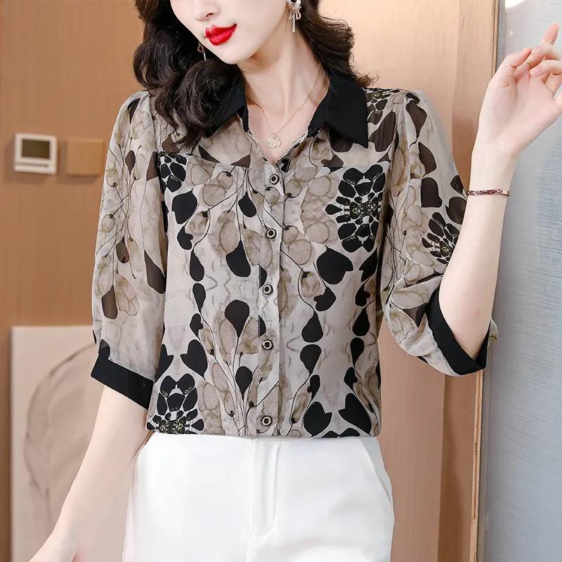 Three-quarter Sleeve Printed Chiffon Shirt for Women Summer New Style Mid-sleeve Shirt for Women with Age-reducing Style and Style