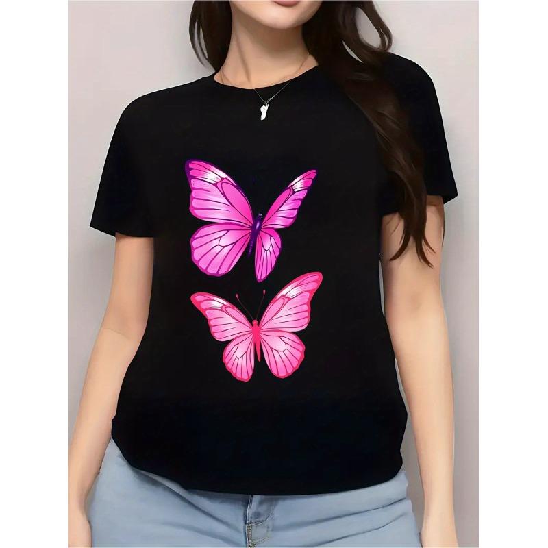Women's Elegant Pink Butterfly Print T-Shirt Crew Neck Short Sleeve Soft Casual Spring Summer Top