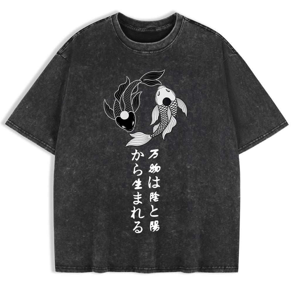 Japanische Koi Harajuku Bedruckte Gewaschene T-Shirts Herren Baumwolle Kurzarm Oberteile Lässig O-Ausschnitt Übergroßes T-Shirt Kleidung