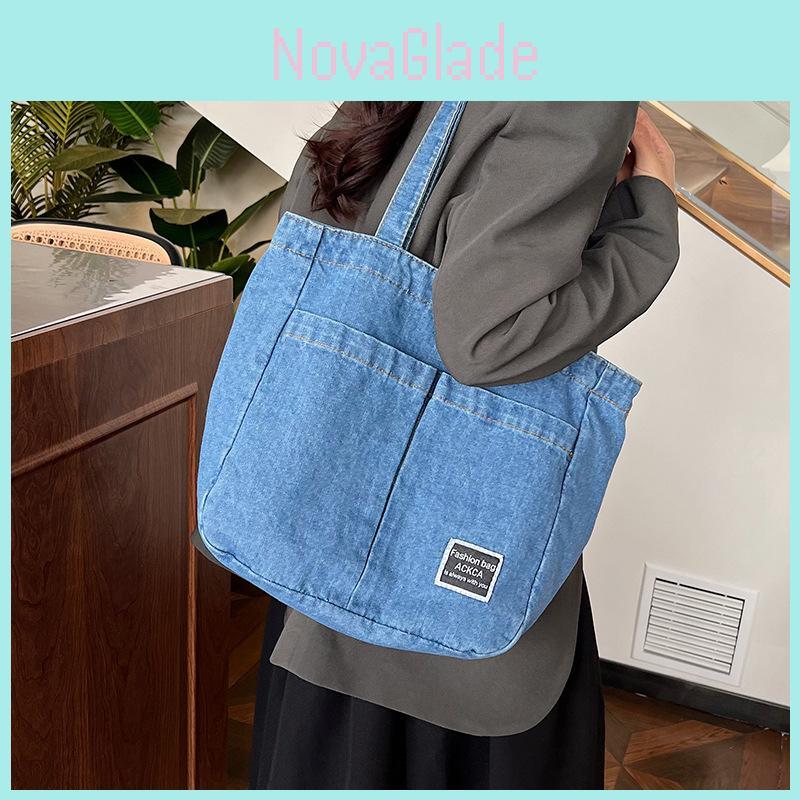 Chic Retro Denim Tote Bag For Women Large Capacity Street Style Shoulder Bag