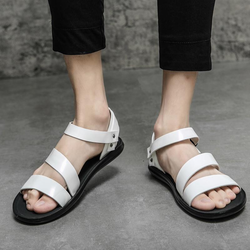 Herren Römersandalen Schwarz Weiß Leder Gladiator Sandalen Outdoor Sommer Offene Zehen Strandschuhe