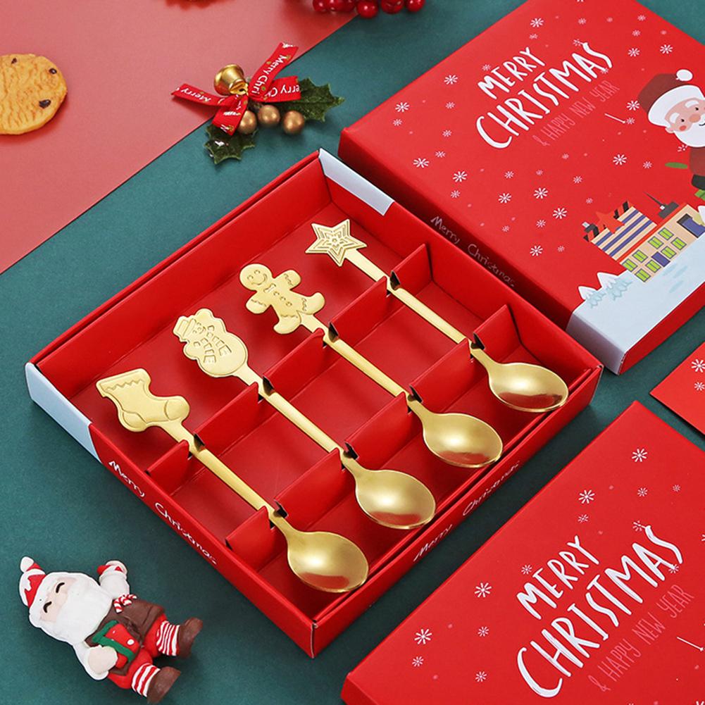 4 Stück Weihnachten Besteck Dessertlöffel Set Festival Spaß Wiedersehen Familie Dekoration Lebensmittelqualität Elegant Rostfrei Weihnachtsbesteck