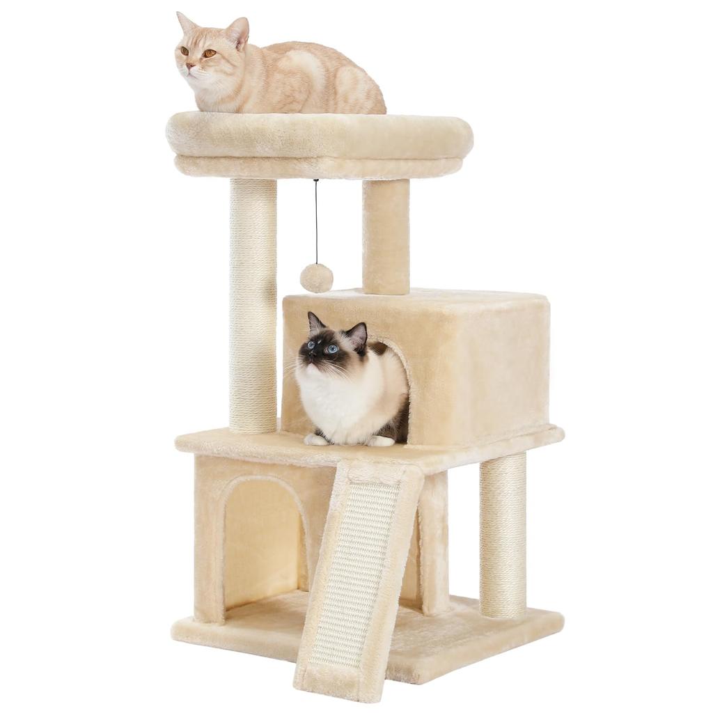 PAWZ Road Mini Katze Ältere Katze Hanfkatze Kratzbaum Höhe Beige - Turm, Klein, Turm, Niedrig, 2-stöckiges Bett, Schlank, Kompakt, Freistehend, Spielzeug,