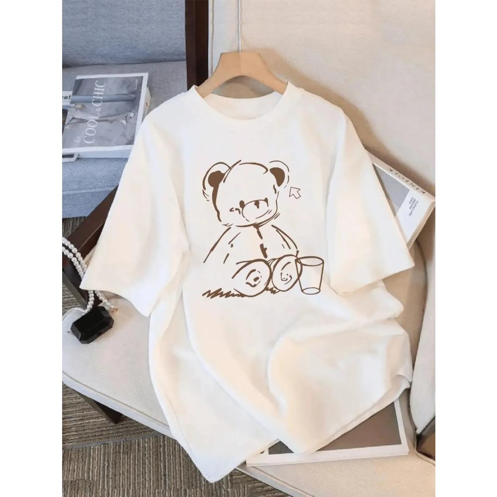 Cute Teddy Bear Print O-Neck Tops Women's Fit Short Sleeve Cartoon Fashion Coffee Cup Kawaii Women Clothing