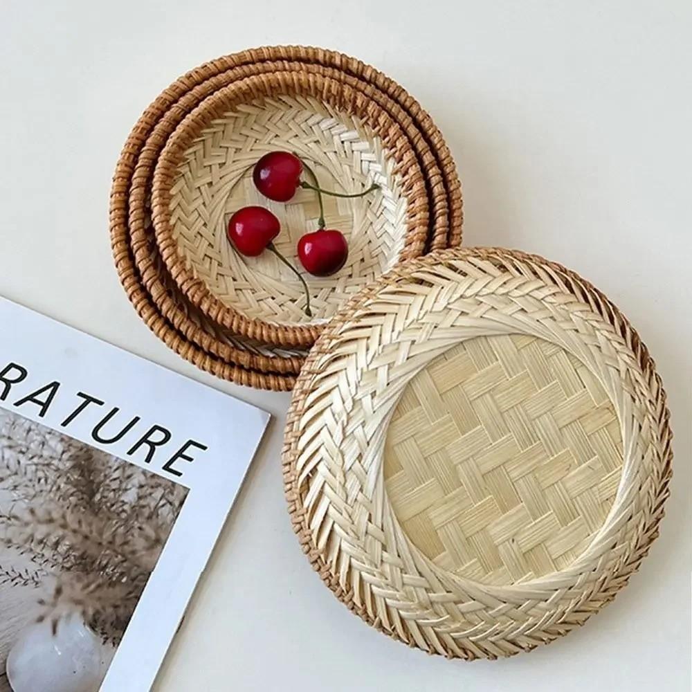 Multi-purpose 5 Sizes Bamboo Fruit Basket Round Shape Handmade Snack Basket Brown Beige Color Tea Snack Tray