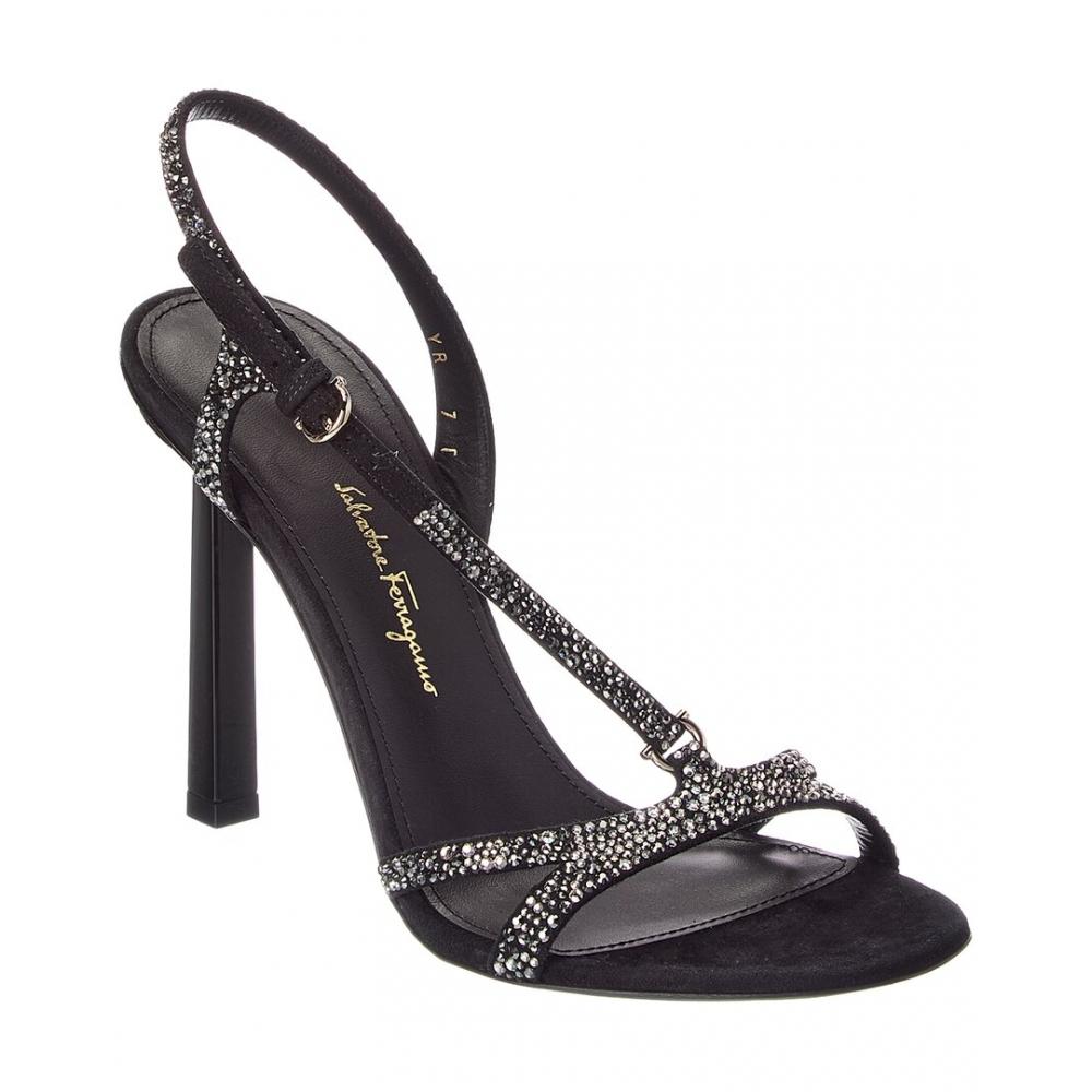 Jole X5 Suede Sandal In Black Suede And Silver-Tone Hardware With Allover Crystals And Gancini Buckle