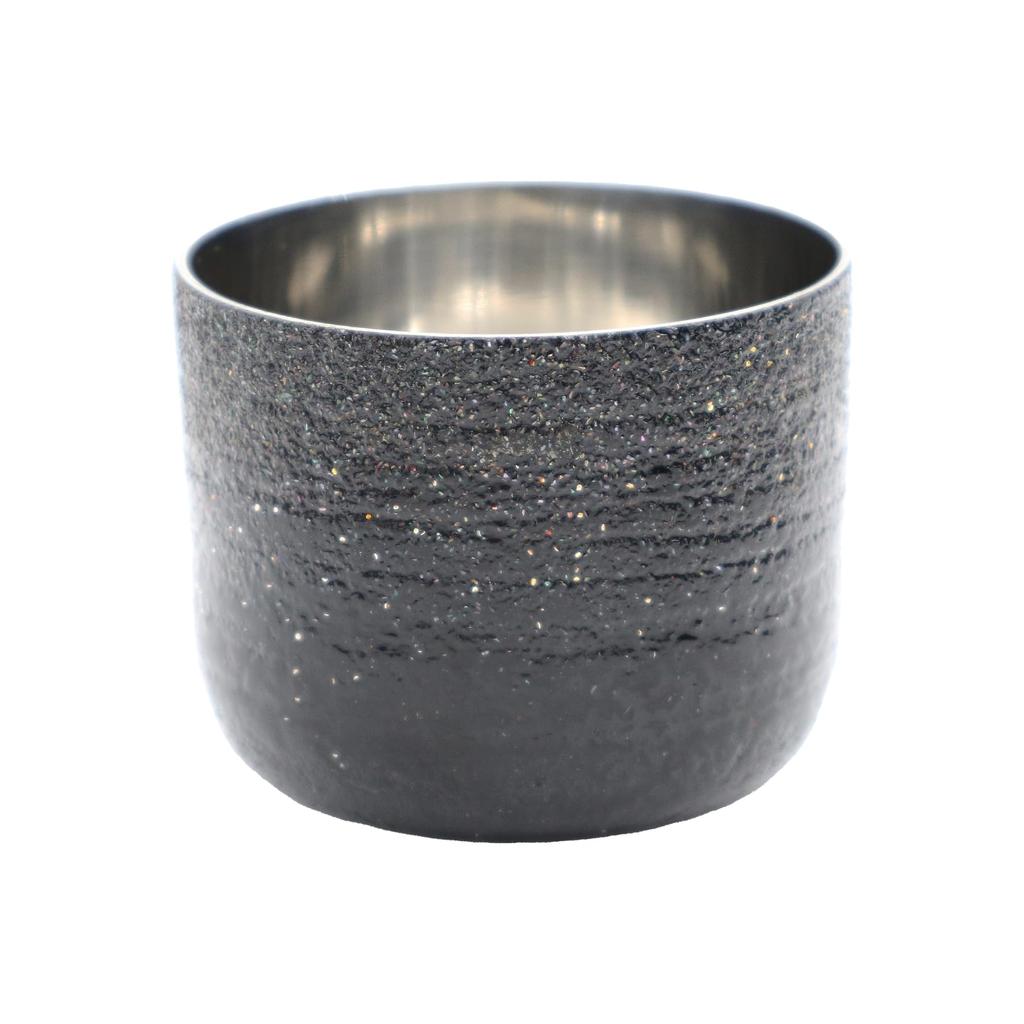 The base material is a high-quality 18-8 stainless steel sake cup, meticulously crafted by skilled artisans in Tsubame-Sanjo, a leading metalworking region in Japan. Craftsmen at Yoshita Kasei Workshop sprinkle zelkova wood powder, create grooves on a potter's wheel, apply generous amounts of natural lacquer in several layers, and then finish it off with mother-of-pearl and silver powder. The lacquer and zelkova wood powder form a thick layer of approximately 3 mm.