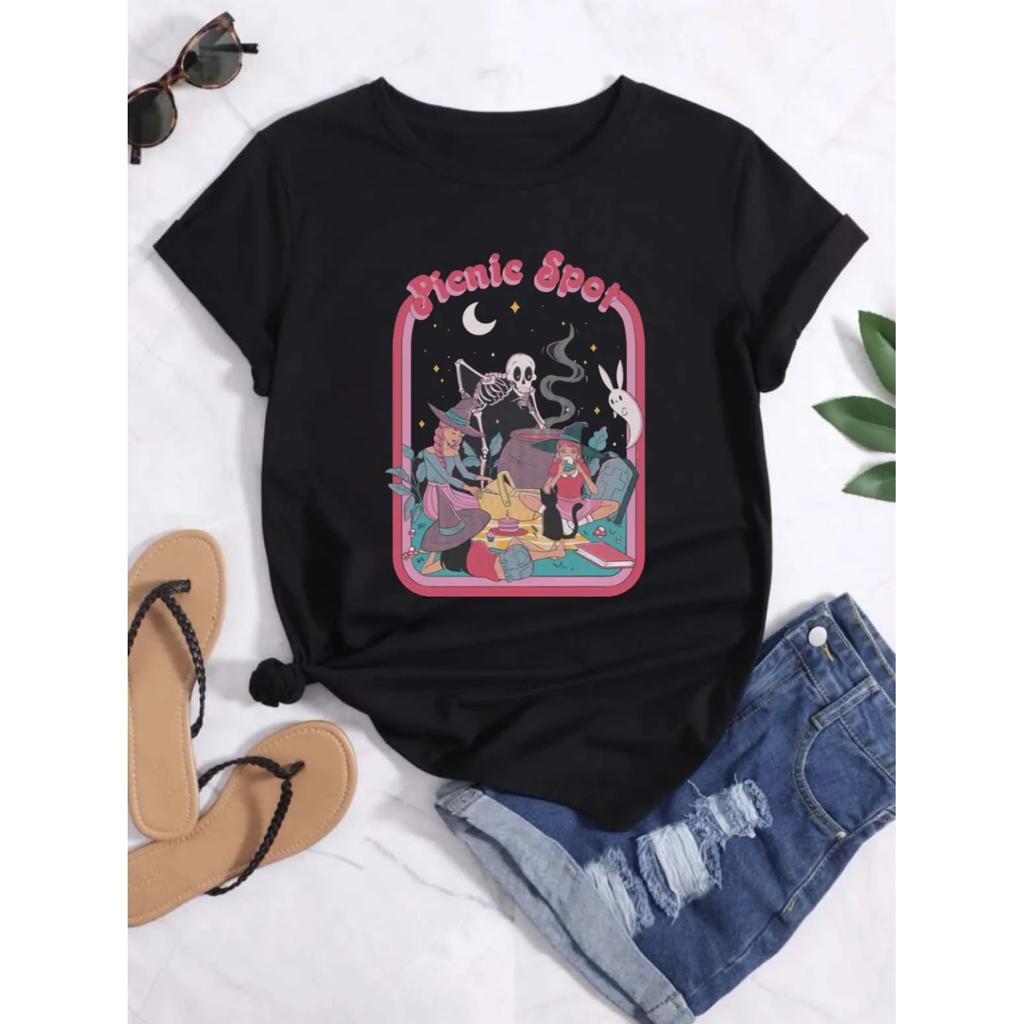 Harajuku Süßes Kurzarm 90er Niedliches Lässiges T-Shirt Kleidung Damen Sommerkleidung Totenkopf Druckmuster Übergröße Lockeres T-Shirt.