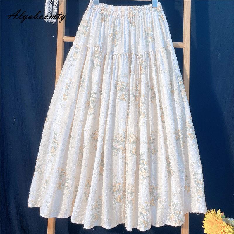Japanese Mori Girl Spring Summer Women A-Line Skirt Elastic Waist Jacquard Cotton Floral Print Skirt Elegant Feminine Midi Skirts Womens