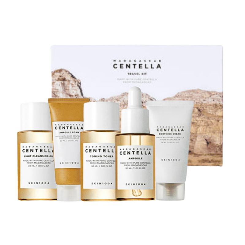 Experience soothing and gentle skincare anywhere with the SKIN1004 Madagascar Centella travel kit. Infused with Centella Asiatica extract, this routine helps calm sensitive skin, hydrate deeply, and maintain a healthy skin barrier. The cleansing oil and foam remove impurities, while the toner, ampoule, and soothing cream provide calming hydration. Perfect for travel or trial use for sensitive and irritated skin.