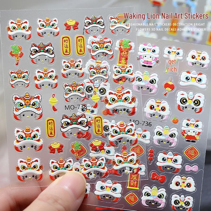 5D Embossed Festive Lion Dance Nail Stickers - National Style