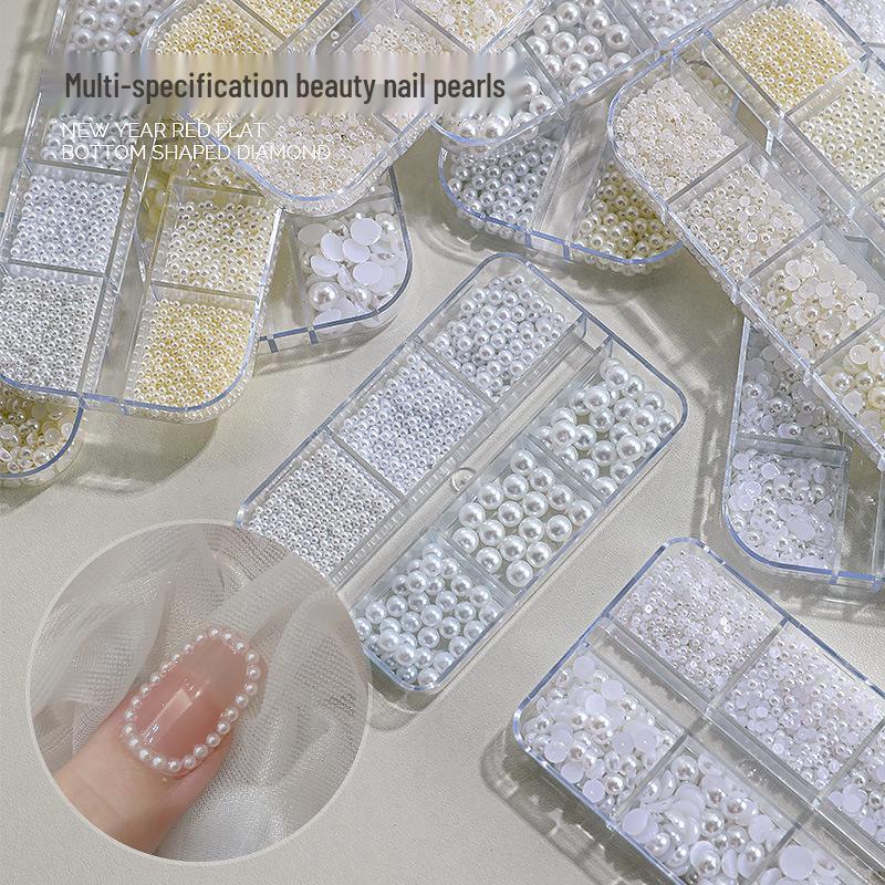 12-Grid Nail Art Pearls: Off-White Mixed Sizes, No Holes, Semi-Circular Boxed Decorations