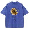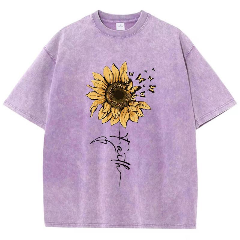 Sonnenblumen- und Schmetterlings-T-Shirt aus gewaschener Baumwolle für Damen, bedruckt, Oberteile, Sommer, O-Ausschnitt, übergroße T-Shirts, Vintage-Kleidung für schwarze Frauen