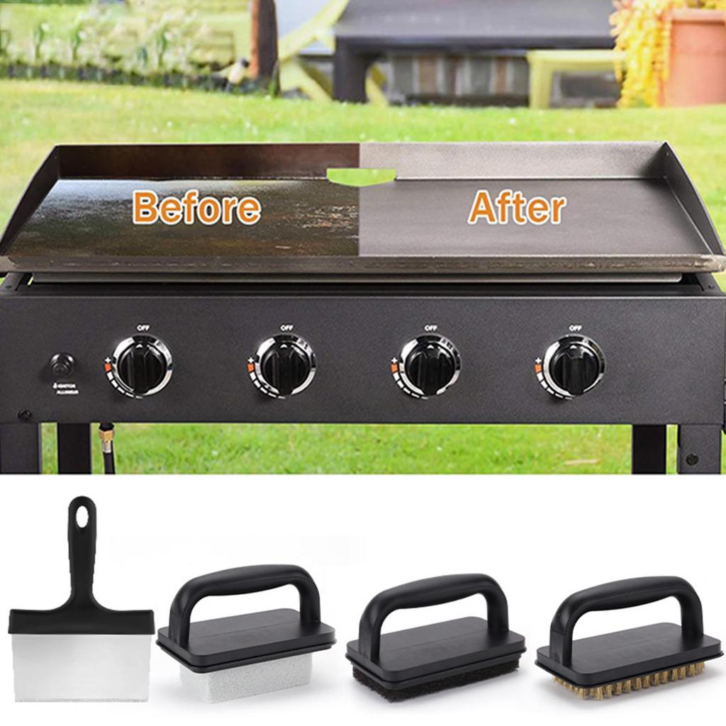 5. Anpassbar Modular: Ausgestattet mit modularen Griffen für den Multi-Modus-Einsatz, gewährleistet dieses Grillplatten-Reinigungskit Anpassungsfähigkeit, wie z. B. das Schneiden oder Servieren von Speisen mit dem mitgelieferten Spatel und die Verwendung des Blocks mit Wellenstruktur als Schärfstein zur effizienten Wartung von Werkzeugen.
