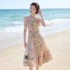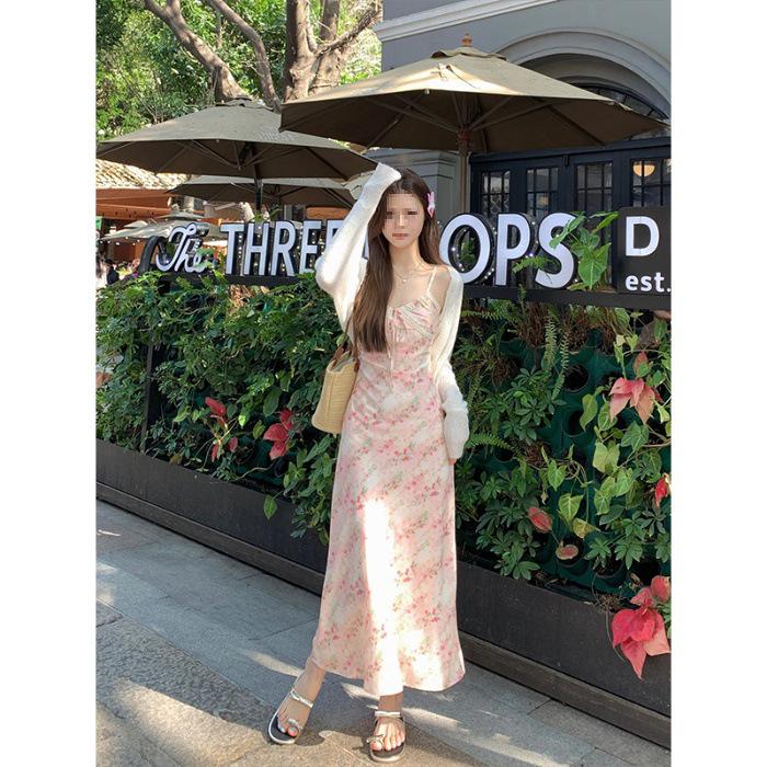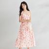 Damen French Hellrosa Geblümtes V-Ausschnitt Spaghettiträger Kleid – Elegant, Tailliert, Schlankmachend, Schnürung Resort Stil