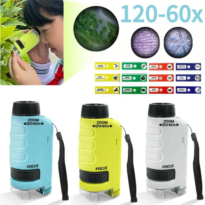 60-120x Mini Handheld Microscope Kit with LED Light for Kids Educational Science Toy Outdoor STEM Learning and Exploration Gift