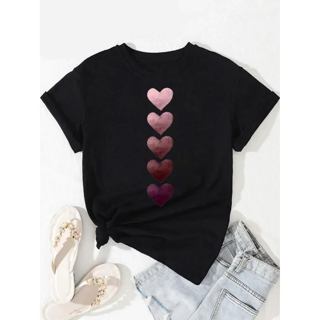 Mode Damen T-Shirt Rosa Herz Print T-Shirt Rundhals Oberteile Weiblich Kurzarm T-Shirt Damen Oberteile Kleidung Streetwear