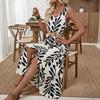 New Sleeveless Leaf Print Maxi Dress With Belt Vacation Style Holiday Long Dress For Women
