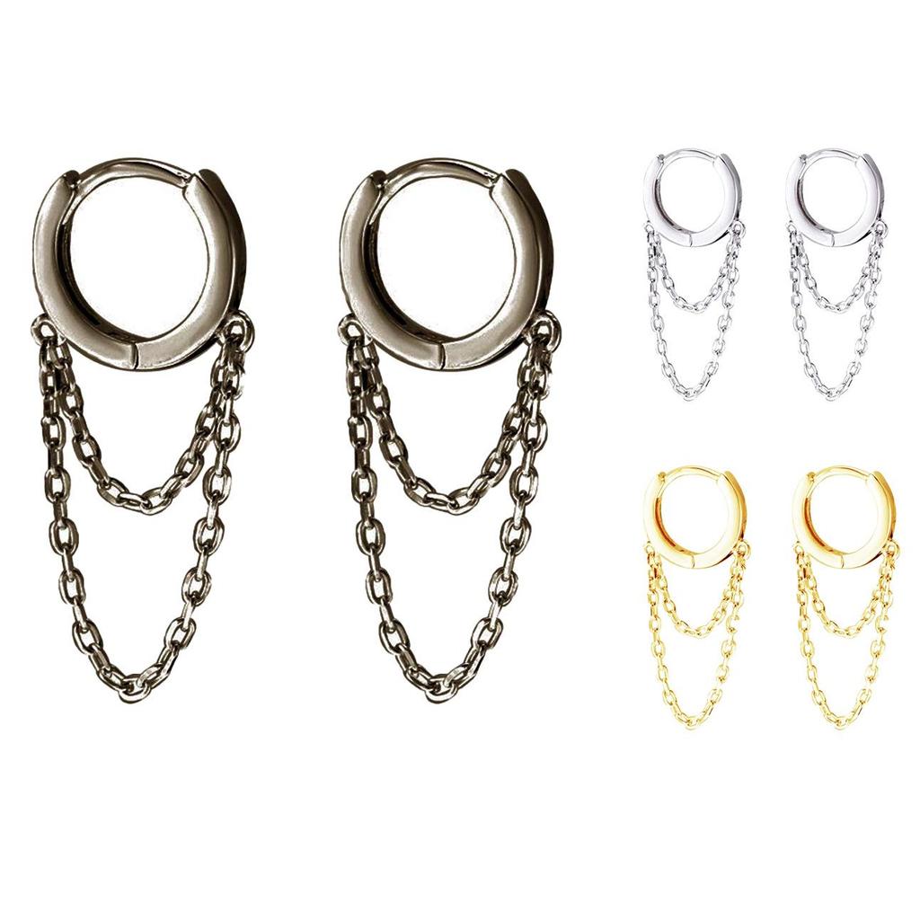 Elegant Double Line Tassel Earrings: 18K Gold, S925 Sterling Silver Studs, Copper Ornament, 14K Gold Chain.