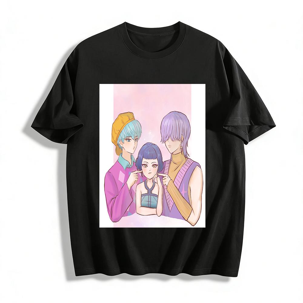 Japanisches Anime-Trio Print Lässiges Oberteil Trendiger Cartoon-Stil Locker Unisex Tägliches T-Shirt Reines Baumwoll-T-Shirt