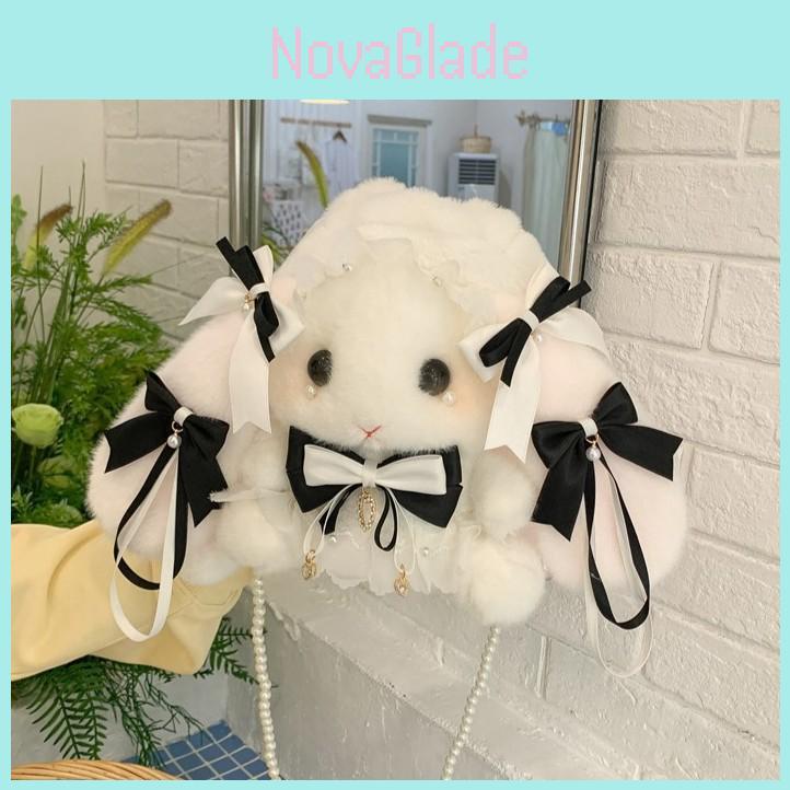 Lolita Bowknot Rabbit Plush Shoulder Bag With Pearl Chain For Daily Casual Use