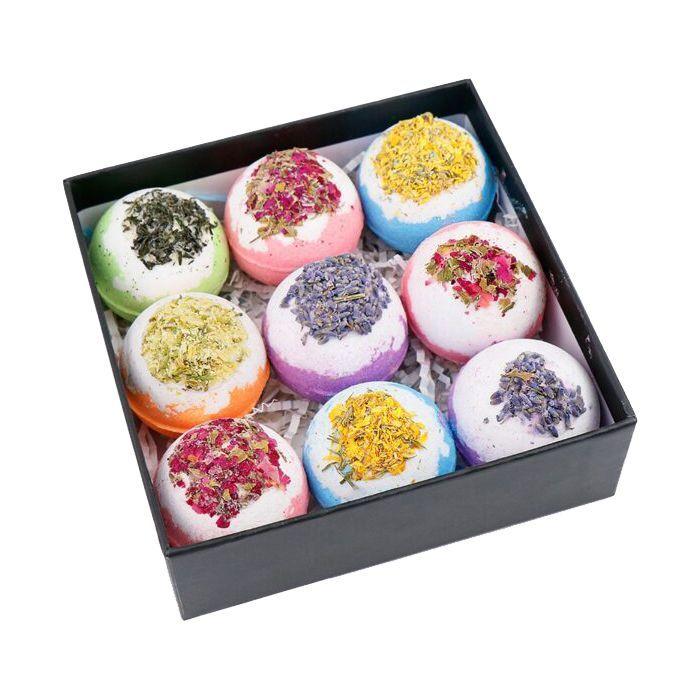 Eine Reihe bunter Badebomben mit ätherischen Ölen (Mehrfarbiges ätherisches Öl Fizzy Fun Badebomben-Set) - Brausekugeln für Wasserbehandlungen. Die Bomben werden aus zertifizierten und vollständig natürlichen und biologischen Inhaltsstoffen handgefertigt, sodass das Produkt sicher für Haut und Umwelt ist.. Die Zusammensetzung der Kugeln umfasst destillierte ätherische Öle, Extrakte aus Rose, Lavendel, Jasmin, Minze, Ringelblume, Mango, Papaya, Orange. Bomben reinigen die Haut, spenden Feuchtigkeit und verjüngen sie und lindern Muskelkater. Diese leuchtenden Bälle mit originellem Design werden Ihnen beim Baden ein wahres Glücksgefühl bescheren.