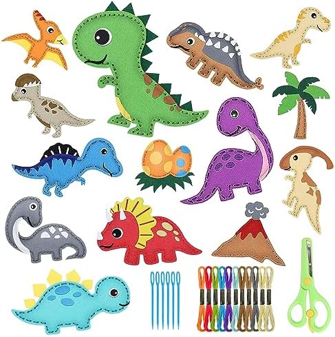 Kinder Nähset 14 Teile Dinosaurier Filz Bastelset, DIY Anfänger Nähset mit Füllwatte Garn Schere, Pädagogisches Kreatives Kunstgeschenk für Jungen Mädchen