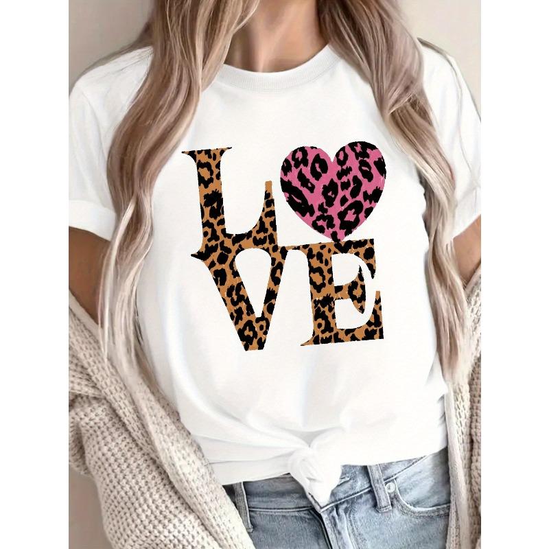 Leopard Heart Print Crew Neck T-Shirt, Casual Short Sleeve T-Shirt For Spring & Summer, Women's Clothing