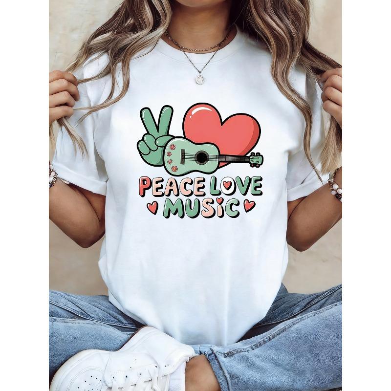 Übergröße - Übergröße - Übergröße, Frieden LIEBE MUSIK Grafikdruck Übergröße Damen Kurzarm Rundhals Lässiges Oberteil für Sommer & Frühling