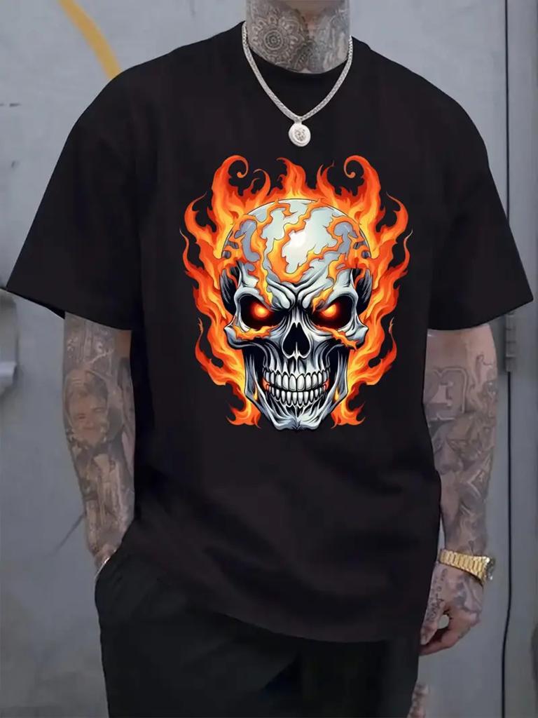 Summer Highquality Mens Tshirt 100 Pure Cotton with Flame Skull Pattern Fashionable Hiphop Gothic Street Mens Clothing
